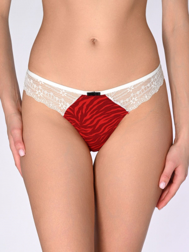 Трусики-бразилиана из хлопка, красного цвета, с принтом, с кружевными вставками белого цвета, с кружевной белой задней частью, на мягкой резинке.