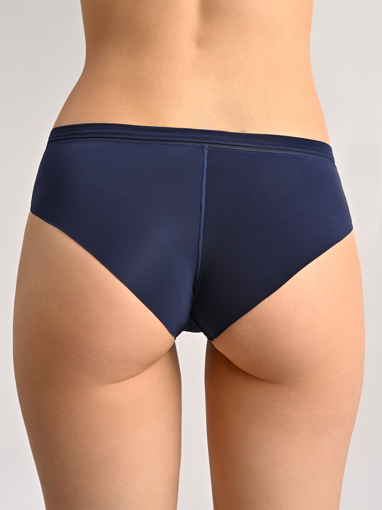 Кружевные трусы бразилиано из эластичного полиамида — прекрасный выбор для ценителей женственного нижнего белья. Резинка не оставляет следов на коже. Глубокий оттенок синего цвета, средняя посадка и частично открытая зона ягодиц придают образу неотразимую притягательность, а небольшое количество эластана в составе делает белье долговечным и тянущимся.