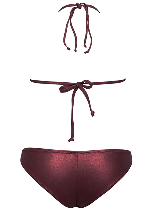 Раздельный купальник: бюстгальтер-триангул с мягкой чашкой которая регулируется сборкой по нижнему краю. Съемные формованные вкладыши без пуш-ап. Застежка - завязка на спинке. Трусики-бразильяна, высота бочка 3 см.