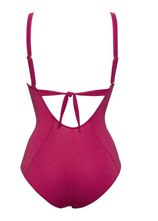 Совместный купальник с формованными чашками (без пуш-ап) на косточках. Передняя часть купальника дублирована укрепленной сеткой обеспечивающей легкий утягивающий эффект и поддержку. Бретель: регулируемая, 2 варианта завязывания. Застежка-завязка на спинке