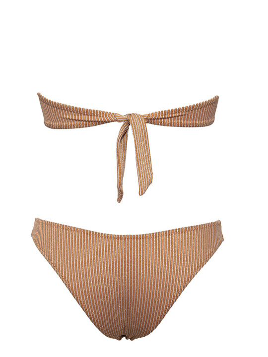 Раздельный купальник: бюстгальтер-бандо с мягкой чашкой без косточек со съемными формованными вкладышами (без пуш-ап). Бочок усилен костью. Отстегивающаяся бретель через шею. Застежка- завязка на спинке. Трусики-бразильяна, высота бочка 3 см.