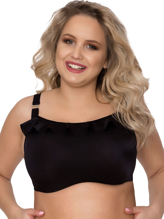 Бюст-топ AN219/2 мягкий, на косточках, с дополнительными боковыми поддержками, продублирован корректирующей сеткой, верх топа декорирован рюшей , на бретелях металлические украшения цвета желтого золота, бретельки регулируются по длине, на спине застёжка, фурнитура металлическая.
