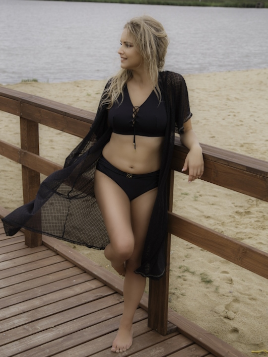 Бюст пляжный AN289 выполнен с мягкими чашками, без косточек, с боковым подкроем, с дополнительными боковыми поддержками, чашки продублированы эластичной сеткой, пояс со стабилизирующей сеткой, между чашек шнуровка, под лифом вшита широкая эластичная резинка, бретельки регулируются по длине, не отстегиваются, на спине застёжка, фурнитура металлическая цвета желтого золота.