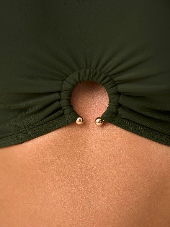 Купальный костюм из эластичного однотонного полотна красивого болотного цвета состоит из топа и плавок. Топ на подкладе с короткими рукавами, без каркасов, боковых корсетных вставок и съемных вкладышей. Декоративное полукольцо с шариками собирает ткань в середине переда изделия и создает объем. Нагрудные вытачки