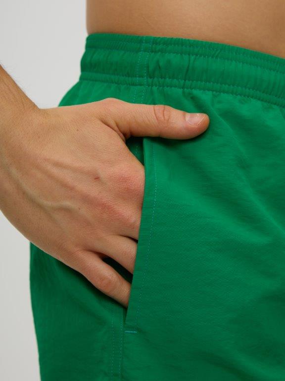 Мужские укороченные шорты из мягкого полотна без эластана. С боковыми карманами с двух сторон. Внутренние плавки из мягкой эластичной сетки. По линии талии широкая резинка и регулируемый шнурок. Подгиб по нижнему краю шорт. Декоратичный резиновый элемент на левой части шорт.
