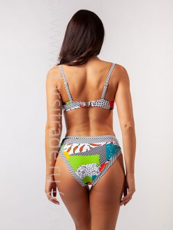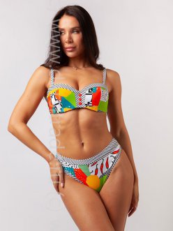 Лиф бандо на каркасе, из тонкого поролона, декольте с контрастным кантом , регулируемые съемные бретели и металлическая застежка на спине. Плавки - слипы средней посадки с контрастным кантом. 82% полиамид/ 18% эластан