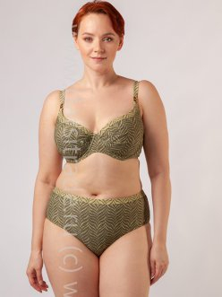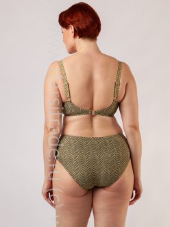 Раздельный купальник. Чашки лифа из тонкого поролона, на косточках, бретели регулируются по длине, на спине металлическая застёжка. Бретели декорированы металлическими элементами цвета матового золота. Трусы-слипы средней посадки, Декольте и верх слипов декорированы контрастным кантом . 82% полиамид/ 18% эластан