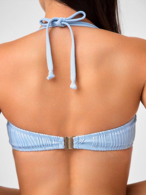 Раздельный купальник из эластичного фактурного полона, имитирующего плиссеровку, нежно голубого цвета. Мягка чашка без каркасов, с боковыми корсетными вставками и съемным вкладышем. Середина грудки украшена U-образной металлической вставкой, которая собирает материал и придает чашкам объем. Бретели съемные, завязываются на шее.На спинке металлическая застежка.Плавки со средней посадкой, на подкладке. По линии талии и вырезу ножек подгиб и плоский шов с резинкой.