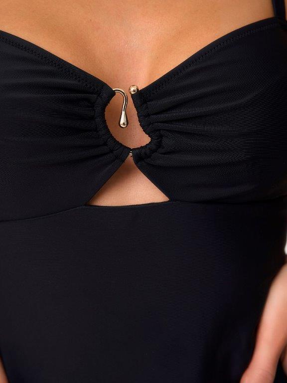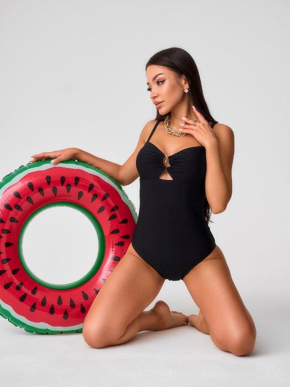 Слитный купальник на покладе. Лиф с мягкими чашками, без каркасов и боковых корсетных вставок, украшен изящным металлическим кольцом, которое собирает ткань лифа и создает объем. Бретели регулируются, не отстегиваются. По верзнему краю лица и спинке и по вырезу ножек подгиб и плоских шов с резинкой.