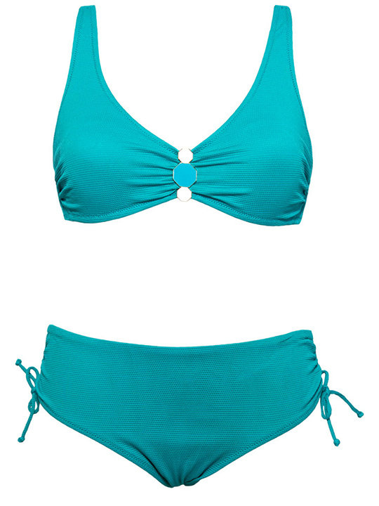 Раздельный купальник: бюстгальтер-балконет с формованной чашкой (без пуш-ап). Боковые детали усилены косточками. Регулируемые бретели с двойным вариантом завязывания. Застежка - поворотный замок. Трусики-слип, высота бочков регулируетя кулиской на 5-11 см