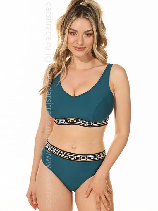 Раздельный купальник: бюстье с формованными чашками и трусики-слип с высокой линией талии. Несъемные широкие бретели. Застежка на повортный замок. 80% полиамид/ 20% эластан
