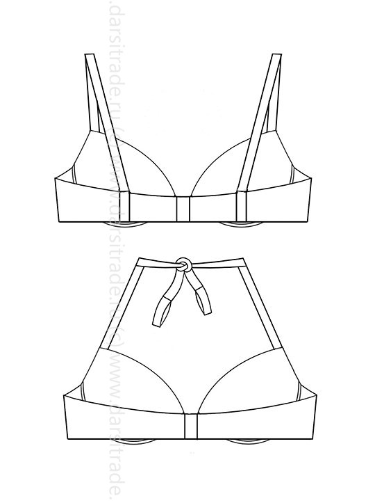 Раздельный купальник: бюстгальтер с мягкой чашкой (без вкладышей), на косточках. Нерегулируемые бретели с двойным вариантом завязывания. Застежка- завязка на спинке. Трусики-слип, высота бочков регулируется кулиской на 5-7 см (высокая и средняя посадка).