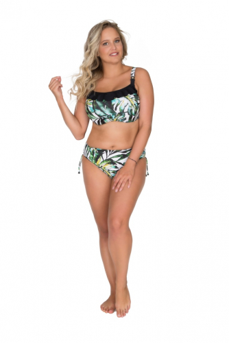 Раздельный купальник: бюстгальтер-триангул с мягкими чашками и трусики-слип на завязках. Застежка - поворотный замок, бретель через шею.