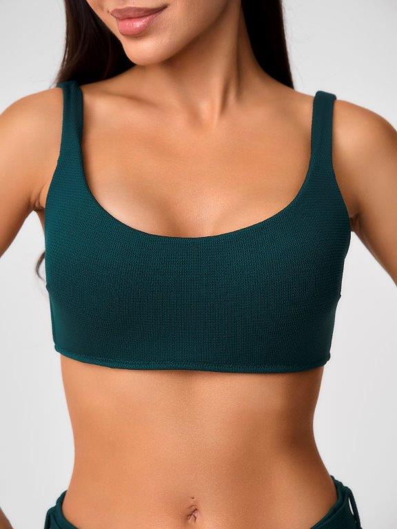 Раздельный купальник с формованнй чашкой soft bra из фактурного полотна. Бюстгальтер с мягкой чашкой из тонкого формованного поролона. Без каркасов, с боковыми корсетными вставками. Бретели широкие, несъемные,регулируемые. Пластиковая застежка. Плавки на подкладе с завышенной линией талии. Эластичный пояс по линии талии с декоративной пряжкой из ткани купальника. Тонкая резинка, подгиб и плоский шов по талии и срезу ножек.