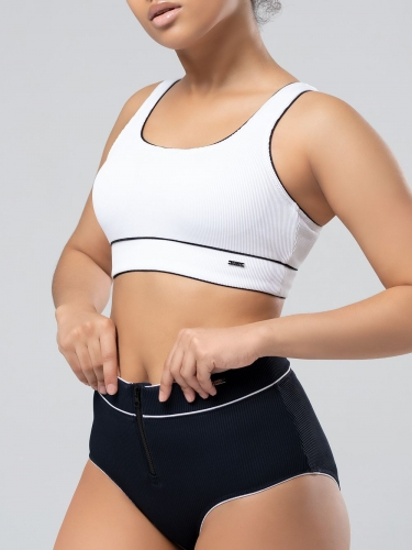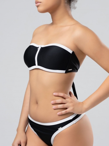 80% полиамид, 20% эластанЖенский купальник бикини с лифом «бандо» и трусиками в модной черно-белой гамме. Лиф имеет встроенные съемные поролоновые чашки и силиконовые напыление по внутренней кромке. Спереди контрастная молния в тон окантовке. Лиф завязывается на спине на бант. Трусики-бразилиана – идеальный компромиссный вариант для пляжа, позволяющий открыть ягодицы для загара и не выглядящий слишком откровенно, как, например, стринги.