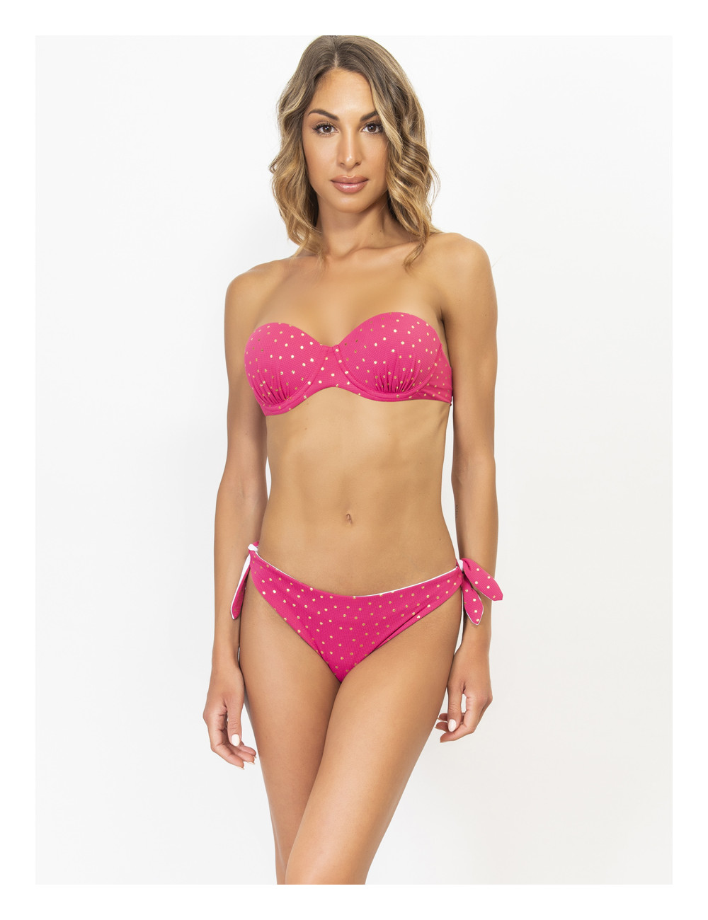 Раздельный купальник: бюстгальтер-фашия с градуированной чашкой (небольшой пуш-ап), на косточках. Отстегивающаяся бретель через шею. Застежка- завязка на спинке. Двусторонние трусики-бразильяна со средней линией талии на завязках.