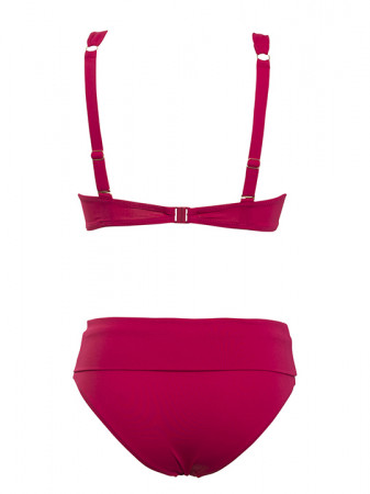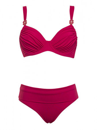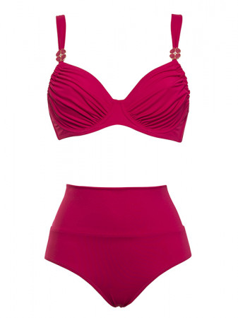 Раздельный купальник: бюстгальтер с мягкой чашкой на косточках, по пройме регулируемая сборка, бочок усилен костью. Трусики-слип с отворачивающимся поясом на высоту 10-16 см (средняя и высокая посадка). Регулируемые бретели с двойным вариантом завязывания. Застежка - поворотный замок.