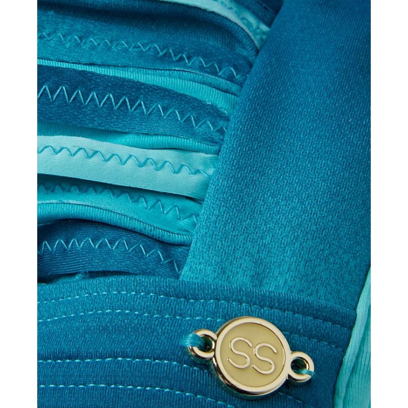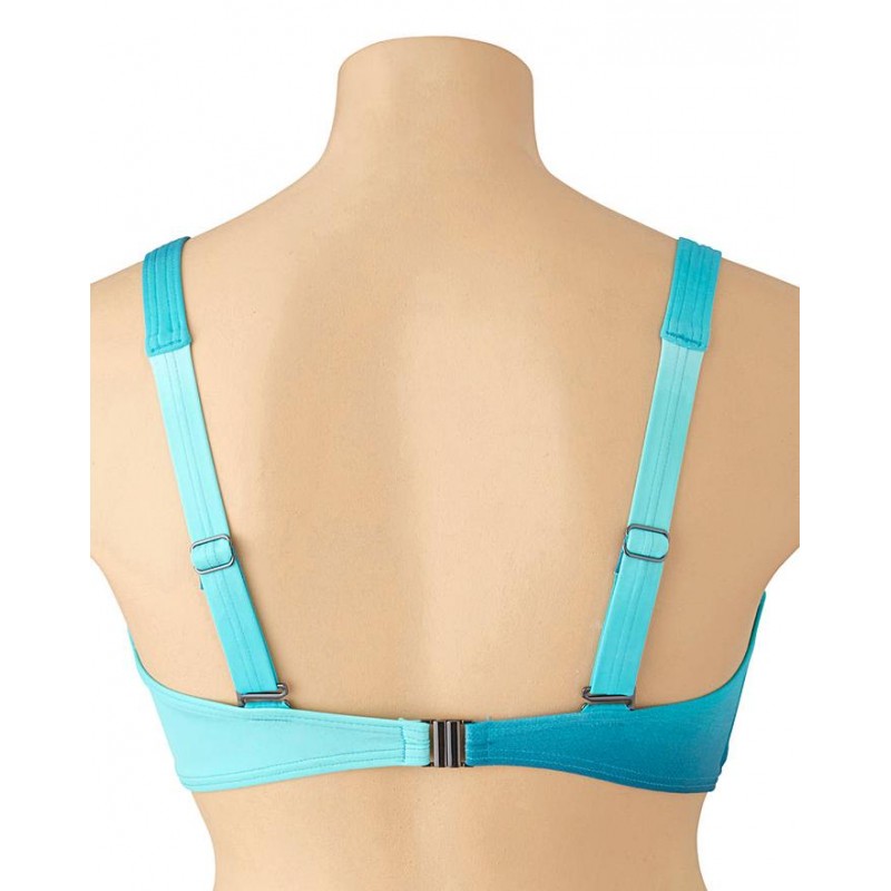 Модель бирюзового оттенка с фиксированными чашечками из пеноматериала, съемной набивкой, застежкой на спине и зигзагообразной строчкой спереди.