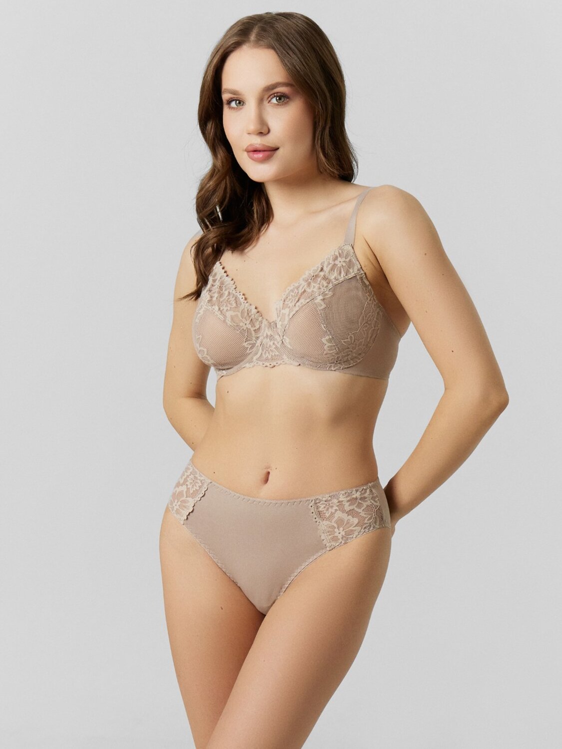Бюстгальтер с мягкими чашками, выполнен из эл. кружева и сетки. На каркасах. Чашки с тройным членением, нижние детали чашек и ластовица на подкладке из монокапрона. Верхний срез чашки обработан жилкой. По верхнему срезу стана и пройме тесьма без зуба (по размерам). По нижнему срезу стана тесьма без зуба (по размерам). Бретель (по размерам). Крючки и регуляторы (по размерам). Застежка (по размерам).