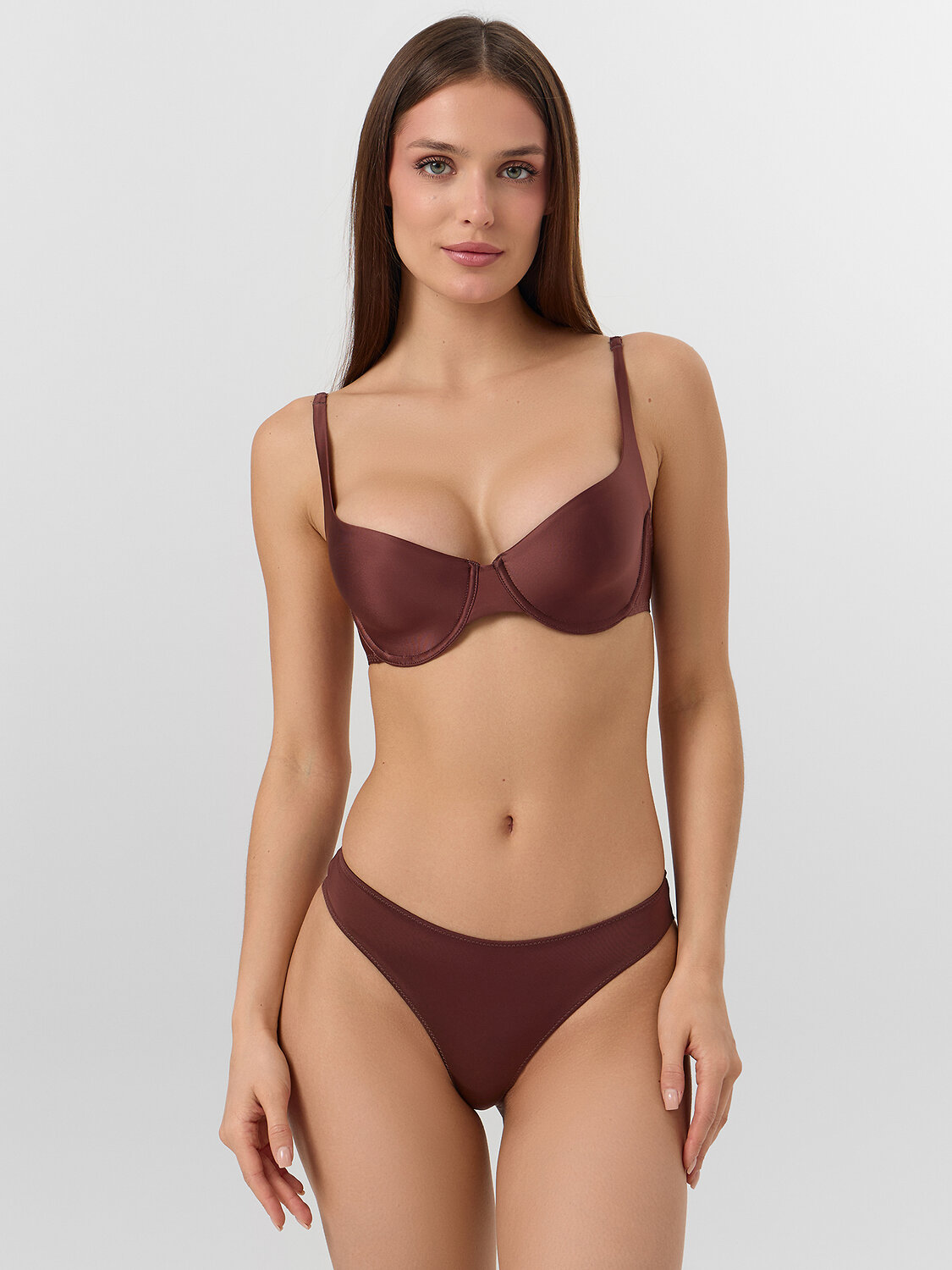Бюстгальтер с мягкими чашками и сатиновым блеском — это баланс изящного силуэта и повседневного комфорта. Его основу составляет нежная микрофибра с благородным, сдержанным сиянием. Мягкие каркасы внутри чашек обеспечивают естественную поддержку и бережно подчеркивают форму, создавая плавные и гармоничные линии.
