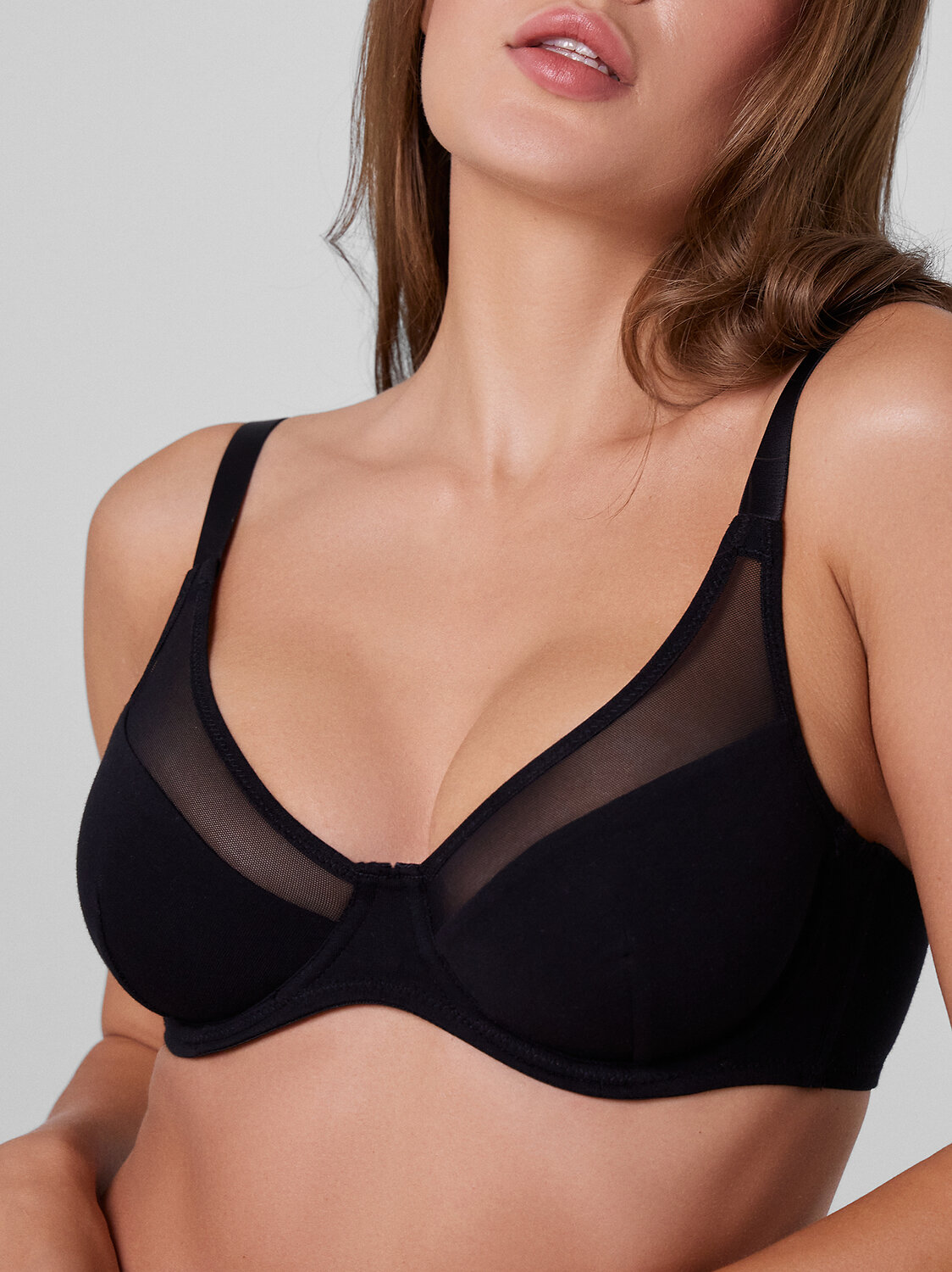 Бюстгальтер макси из трикотажного кулирного полотна с отделкой эластичной сеткой, каркас 50 тип. Чашка с горизонтальным рельефом, верхняя деталь выполнена из сетки, нижняя деталь с вытачкой из кулирного полотна на подкладке из кулирного полотна. Верхний и боковой срезы чашки окантованы эластичной тесьмой.