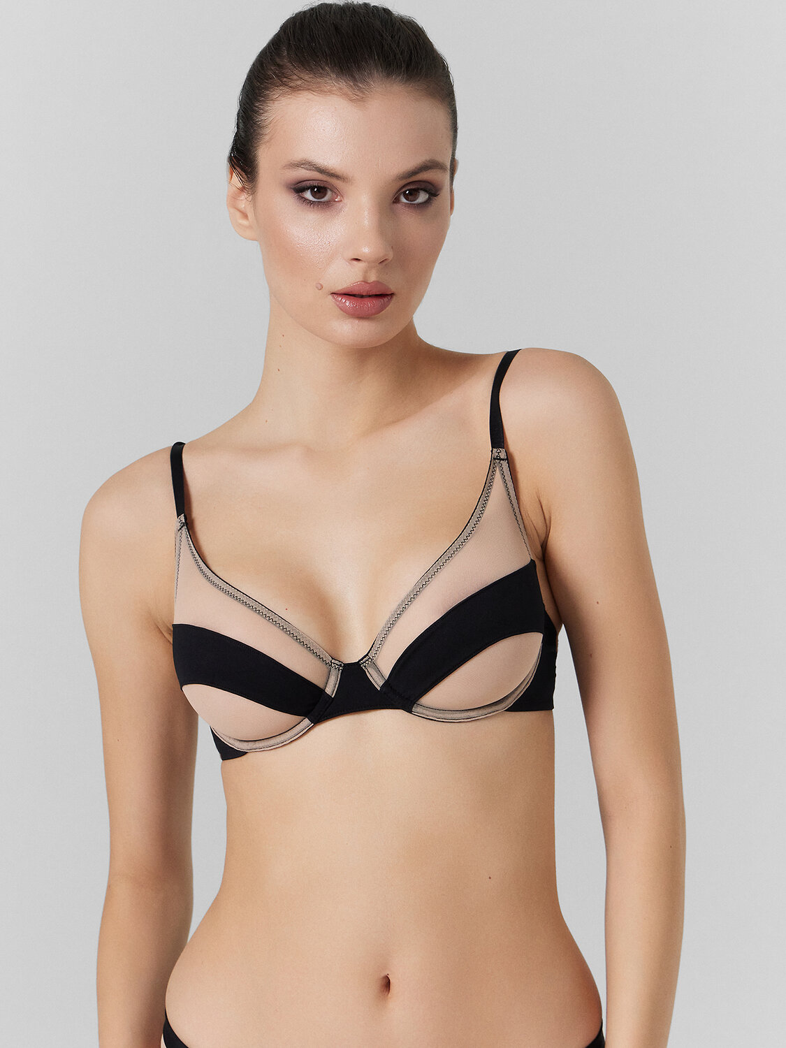 Бюстгальтер с мягкой чашкой из микрофибры с отделкой эластичной сеткой, каркас 47 тип. Чашки с тройным членением: верхняя деталь из сетки, нижние-из микрофибры, на подкладке из эластичной сетки. Верхний срез чашки обработан эластичной тесьмой.