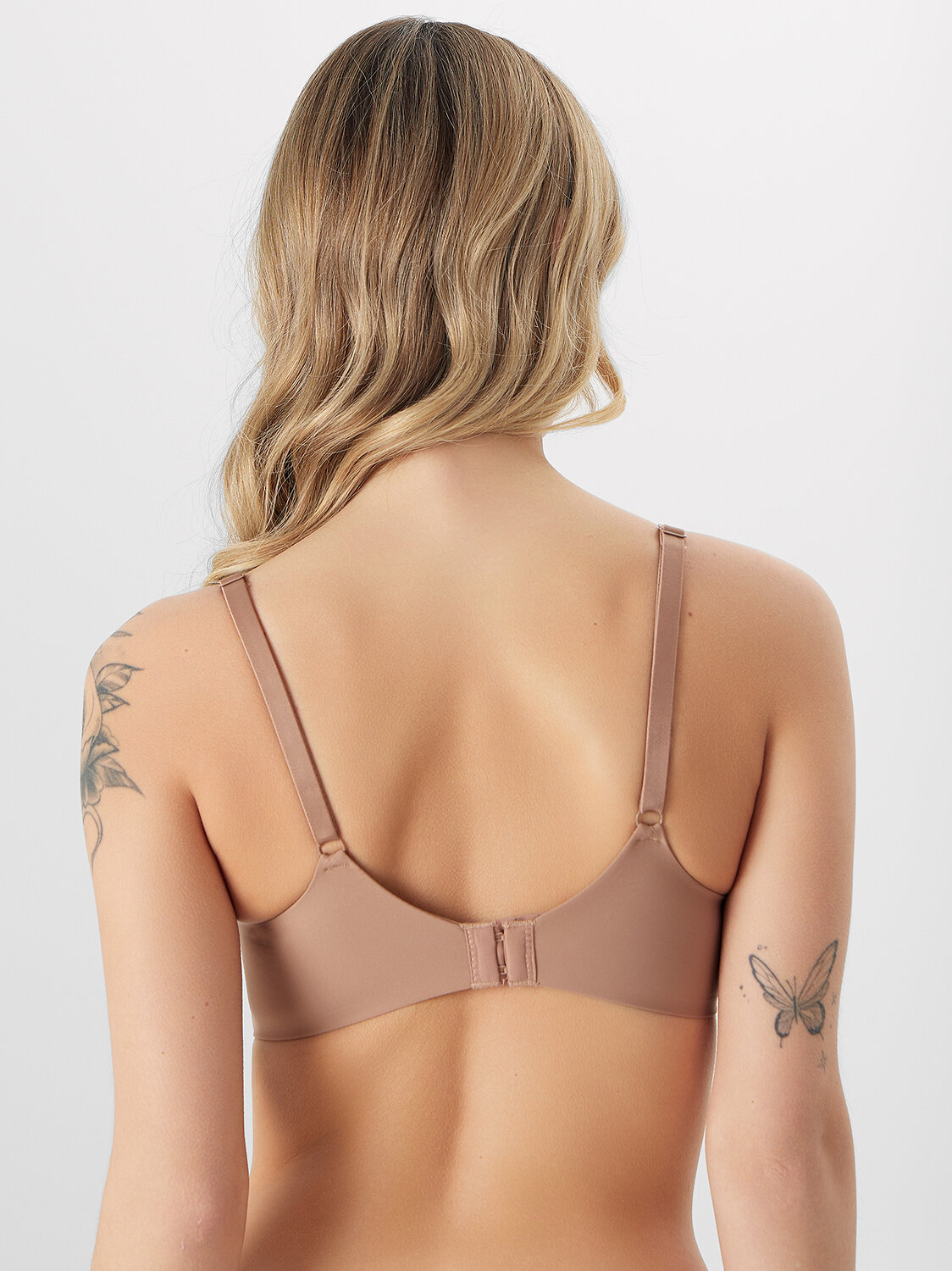 Бюстгальтер имеет формованные чашки, которые обеспечивают естественную поддержку и мягко повторяют форму груди без использования косточек или вставок push-up. Это делает модель особенно удобной, так как она практически не ощущается на теле. Дизайн бюстгальтера выполнен в классическом стиле, без лишних деталей, что делает его незаметным под облегающей и тонкой одеждой.