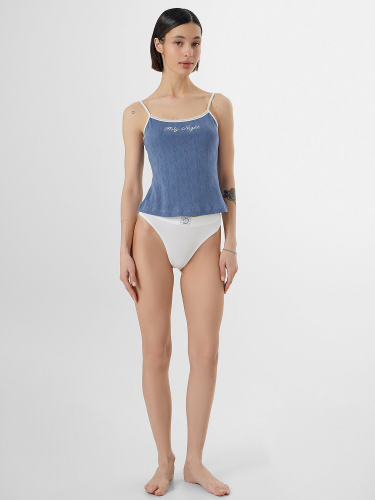 Топ женский из рибаны, силуэт прилегающий. Верхний край переда и спинки обработан кружевом 1,5 см (код L56-1,5 см, артикул L20166). Бретели из основного полотна, внутри жилка 6 мм (WT4-6, девсель 13460W). Нижний срез обработан швом вподгибку.