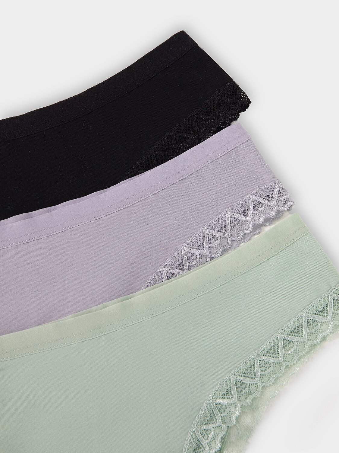 Мультипак (3 штуки) хлопковых слип-бикини из натурального, гипоаллергенного, дышащего полотна. Линия талии невысокая. По поясу и ножкам – нежная кружевная лента. Отличный повседневный вариант в базовой расцветке!
