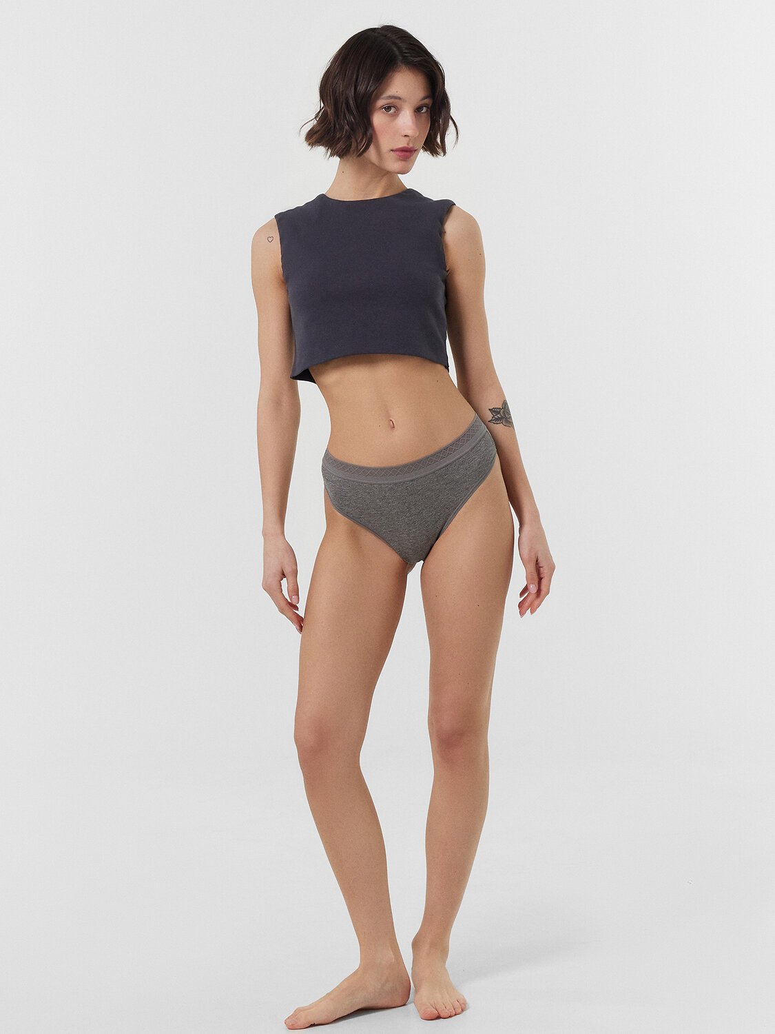 Слип-бикини из натурального хлопкового полотна – гипоаллергенного и приятного на ощупь. Линия талии завышена, бедра открыты. Верхний срез обработан декоративной тесьмой, по ножкам – жилка. Базовая расцветка!