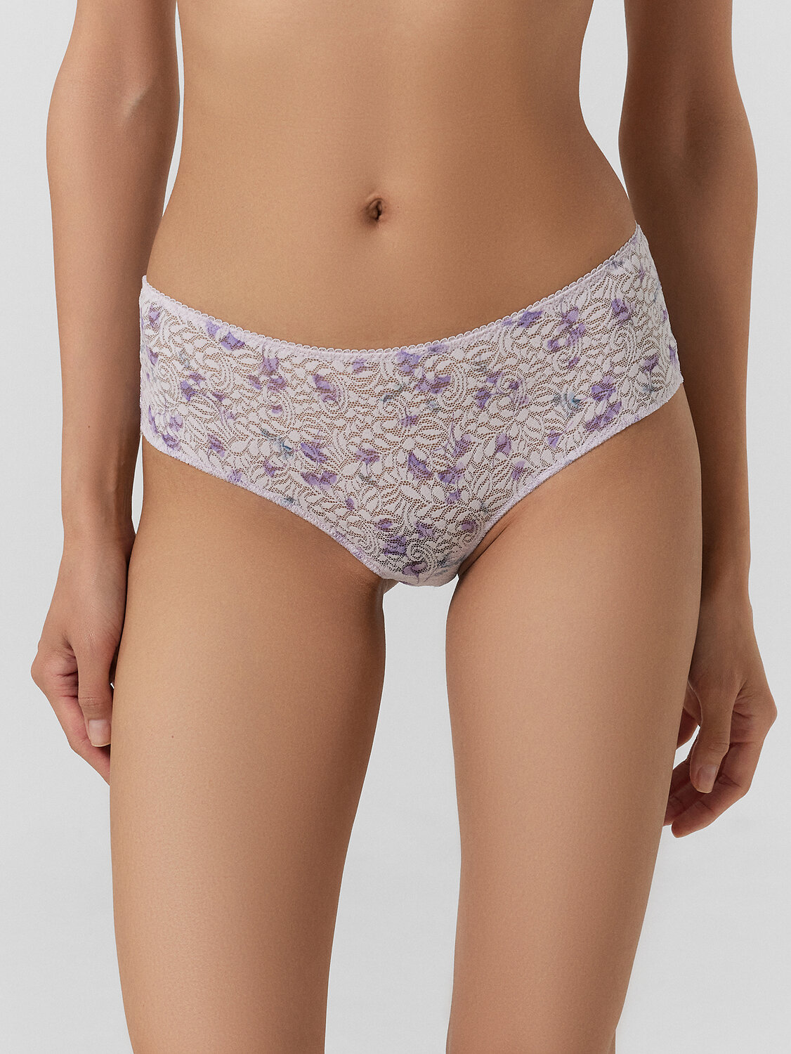 Трусы женские, средняя линия талии, шорты. Передняя деталь выполнена из кружевного полотна. Задние детали выполнены из кружева. Подкладка ластовицы из хлопка, отлетная по верхнему срезу. Верхний срез обработан тесьмой с зубом. Нижние срезы передней детали обработаны жилкой.