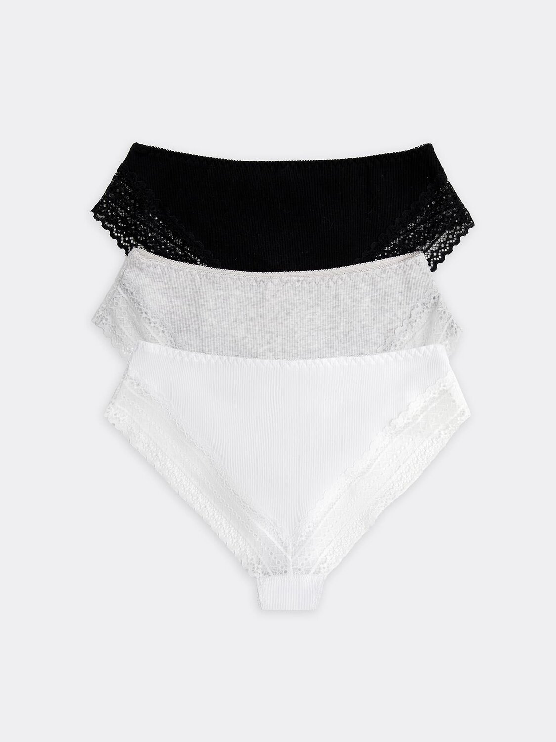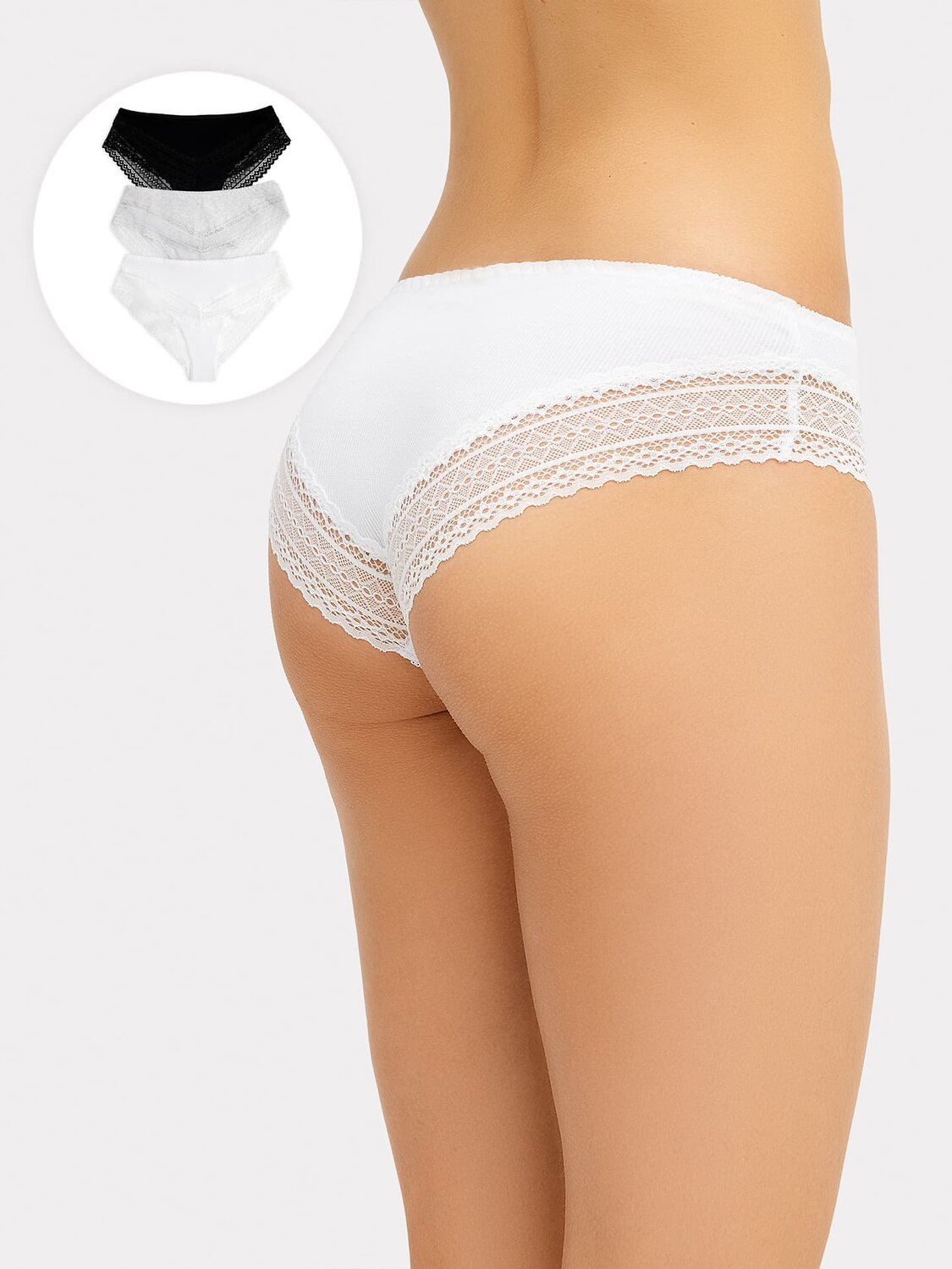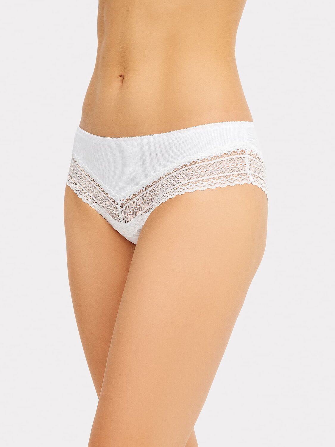Трусы женские силуэта слип со средней посадкой из рибаны. По талии эластичная тесьма с зубом настрочена на 4-укольном зигзаге. Ножки обработаны узким кружевом шириной, на передней и задней частях со средним швом. Подкладка ластовицы из кулирной глади. Срезы ластовицы обработаны эластичной тесьмой с зубом на п/ш с изнаночной стороны.