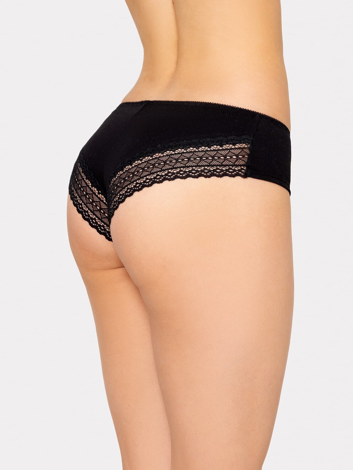 Трусы женские шорты со средней посадкой из рибаны. Передняя деталь цельная. Задняя деталь со средним швом, по ножкам узкое кружево шириной. Нижняя ластовица отлетная по переднему срезу, выполнена из кулирной глади. По талии тесьма эл с зубом настрочена на 4-укольном зигзаге.. Ножки обработаны на плоскошовной машине без эластичной тесьмы.