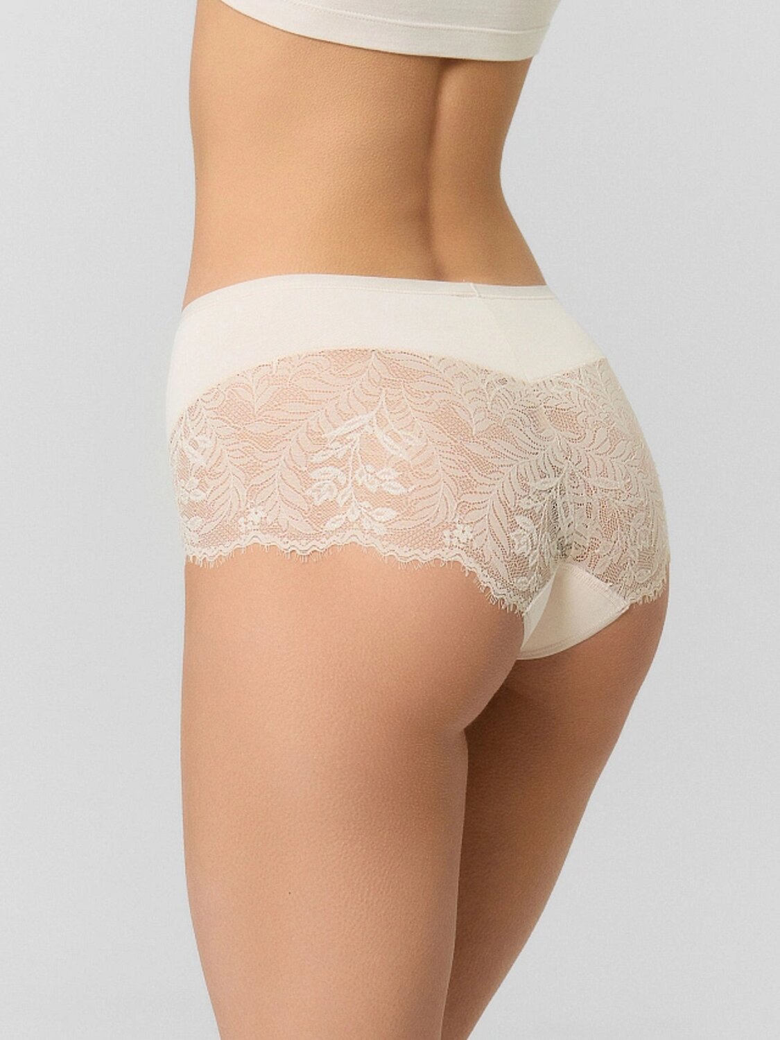 Трусы женские макси с высокой посадкой из кулирного полотна и эластичного кружева. Перед с вертикальным и горизонтальным членением. Передняя центральная деталь из кулирного полотна с наложением наверх эластичного кружева. Ластовица отрезная на подкладке из основного полотна. Срезы ластовицы обработаны эл тесьмой 6 мм (жилка тканая Wt4-6, девсел 13460 W) с наложением на лицевую сторону полотна и с узким верхним застилом в край. Задняя деталь со средним швом и с горизонтальным членением. Вертикальные и горизонтальные швы собраны на ширителе. Верхний срез обработан эластичной тесьмой 10 мм (жилка тканая Wt4-10, девсел 13460 W) с наложением на лицевую сторону полотна и с узким верхним застилом в край. жемчуг