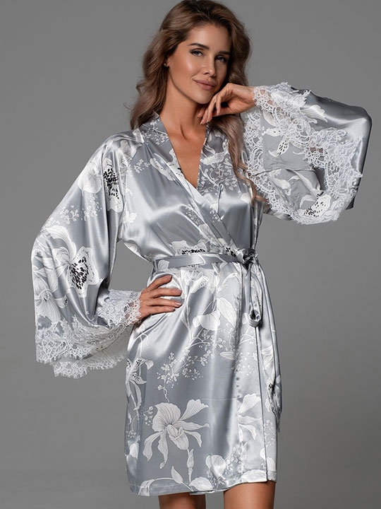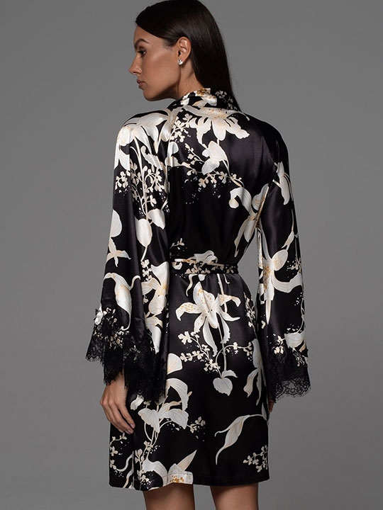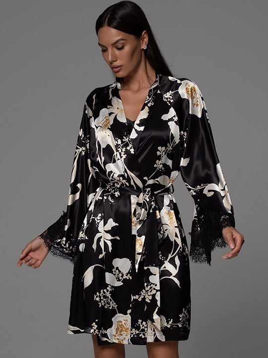 Черный XXL/XXXL, XXXXL/XXXXXL Короткий запашной халат Mia-Amore с длинными рукавами выполнен из принтованного смесового шёлка. Широкие рукава халата по низу декорированы изящным широким кружевом. Халат комплектуется поясом, в боковых швах карманы. 70% натуральный шёлк, 25% полиэстер, 5% эластан
