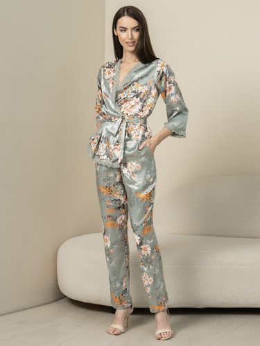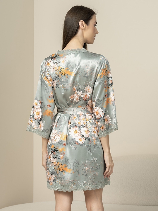Серебристый L//XL, XXL//XXXL, XXXXL/XXXXXL Короткий халат Mia-Amore выполнен из смесовой принтованной ткани. Ажурное кружево расположено по низу рукавов, борту и низу халата. 70% натуральный шёлк, 25% полиэстер, 5% эластан