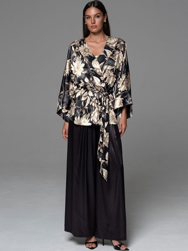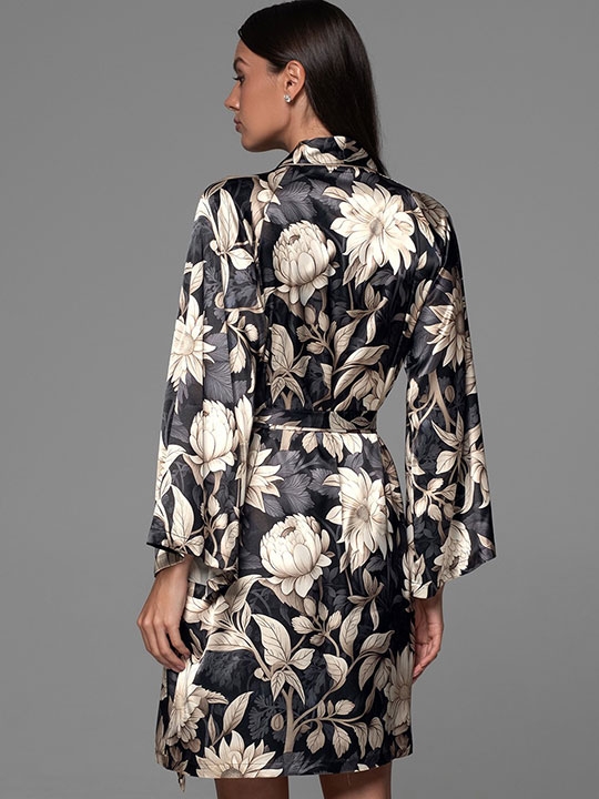 Мультицвет S/M, L/XL, XXL/XXXL, XXXXL/XXXXXL Короткий халат-кимоно Mia-Amore с широкими рукавами длиной 3/4. Халат выполнен из принтованного смесового шелка с отделкой в виде контрастного канта по бортам изделия. В боковых швах обработаны карманы. 70% натуральный шёлк, 25% полиэстер, 5% эластан