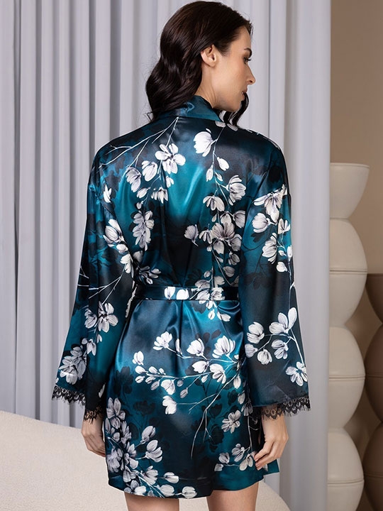 Изумруд S/M, L/XL, XXL/XXXL, XXXXL/XXXXXL Короткий запашной халат Mia-Amore с длинными рукавами выполнен из смесового шёлка с цветочным фантазийным принтом. По низу рукава халата украшены изящным кружевом. Халат комплектуется широким поясом, в боковых швах карманы. 70% натуральный шёлк, 25% полиэстер, 5% эластан