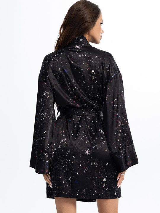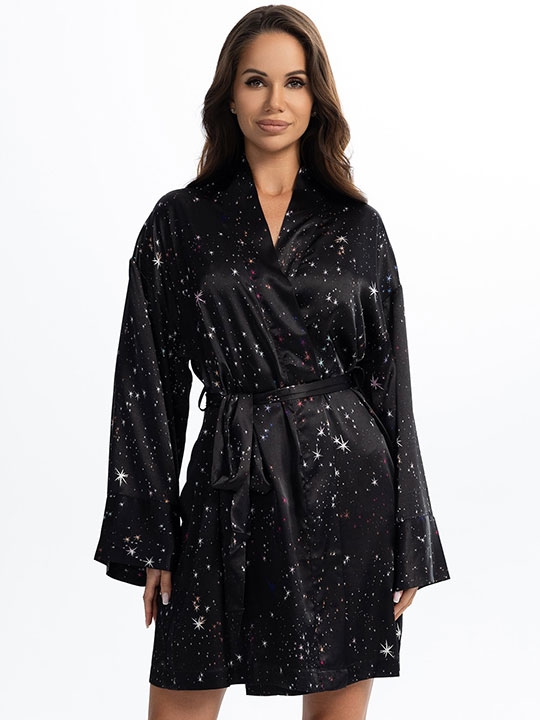Мультицвет S/M, L/XL, XXL/XXXL Короткий запашной халат Mia-Amore с длинными рукавами выполнен из принтованного искусственного шёлка. Халат комплектуется широким поясом, в боковых швах карманы. 100% полиэстер
