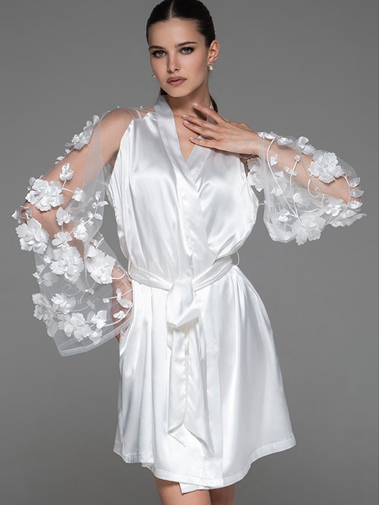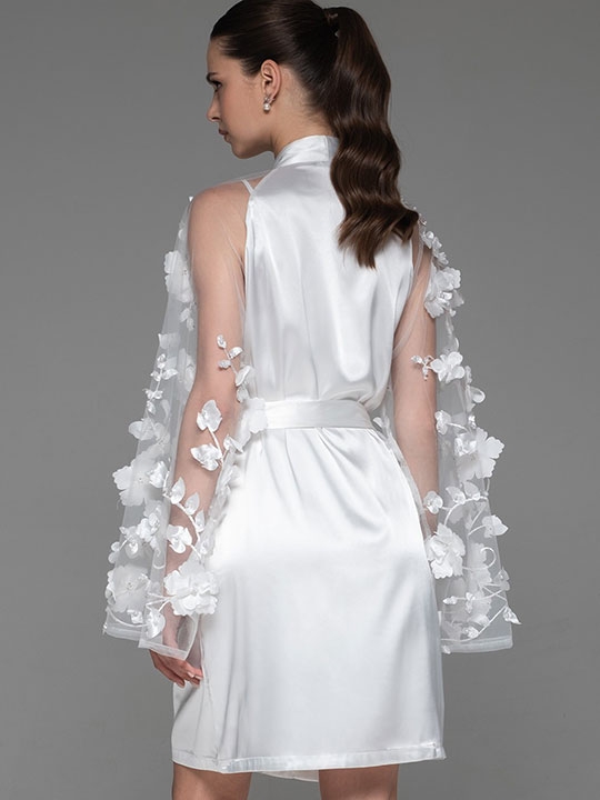 Черный XS Короткий халат Mia-Amore выполнен из смесового шёлка в сочетании с эффектной сеткой с цветами. Эффектные расширяющиеся к низу рукава выполнены из мягкой сетки с объёмными цветами. Халат завязывается широким атласным поясом. 70% натуральный шёлк, 25% полиэстер, 5% эластан