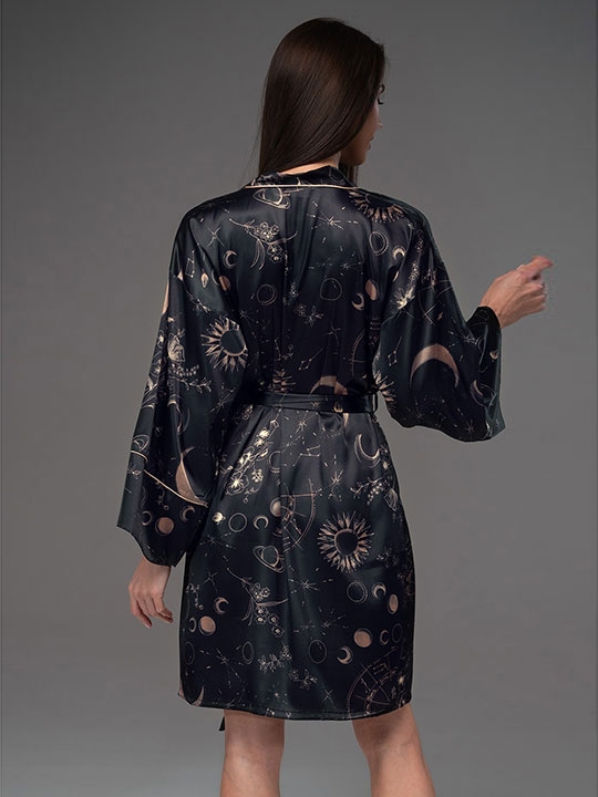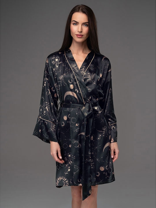 Черный S/M, L/XL, XXL/XXXL, XXXXL/XXXXXL Короткий запашной халат Mia-Amore выполнен из принтованного смесового шёлка. Широкие манжеты халата и планка отделаны золотым кантом. Халат запахивается на широкий пояс, в боковых швах есть карманы. 70% натуральный шёлк, 25% полиэстер, 5% эластан