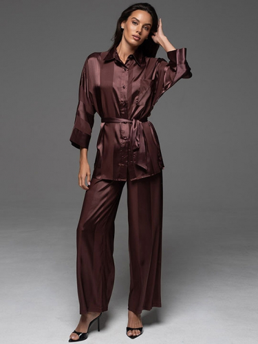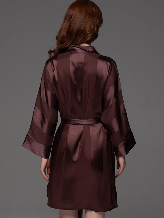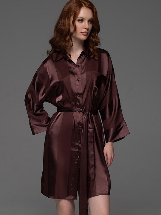 Шоколад S/M, L/XL, XXL/XXXL Халат Mia-Amore с застежкой на пуговицы свободного силуэта и с длинным рукавом. Изделие выполнено из однотонного искусственного шелка на жаккардовой основе в виде широких полос, которые расположены вертикально. В боковых швах изделия расположены карманы. Линию талии можно подчеркнуть за счет широкого пояса, который идет в комплекте. 100% полиэстер