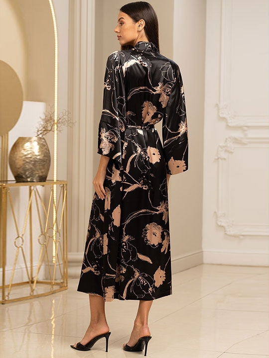 Черный XXXXL/XXXXXL Длинный запашной халат Mia-Amore с широким рукавом длиной 3/4. Халат выполнен из принтованного смесового шелка. По бокам изделия обработаны карманы. 70% натуральный шёлк, 25% полиэстер, 5% эластан