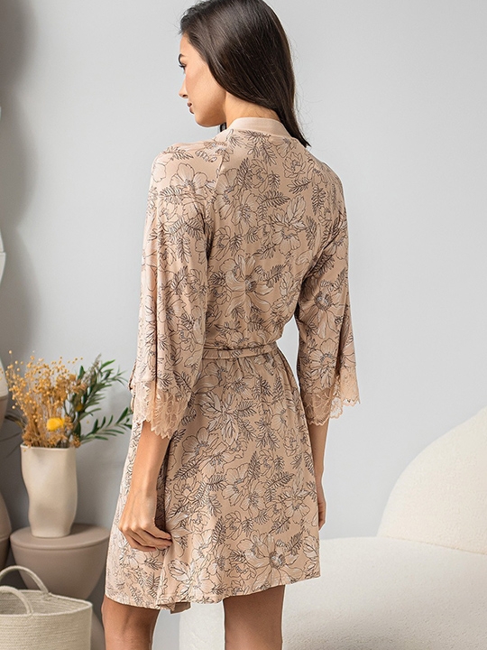 Бежевый S/M, L/XL, XXL/XXXL Короткий запашной халат Mia-Amore с рукавом длиной три четверти. Халат выполнен из принтованного трикотажного полотна с однотонной и кружевной отделкой. По бокам расположены карманы. 95% вискоза, 5% эластан