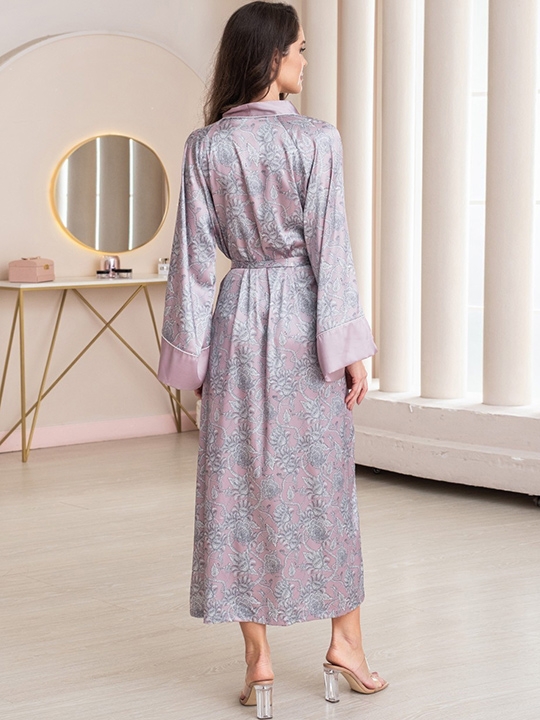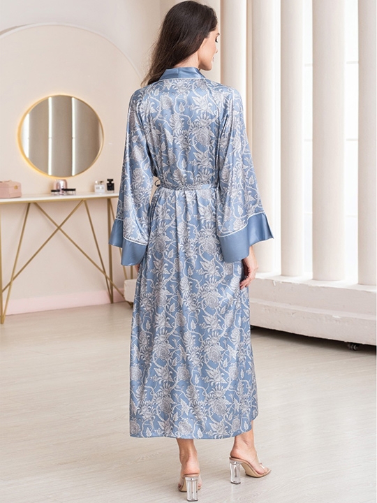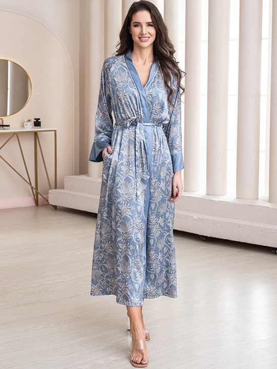 Голубой_жемчуг XXXXL/XXXXXL Длинный халат-кимоно Mia-Amore с широким рукавом длиной 3/4 . Халат выполнен из принтованного смесового шелка с однотонной отделкой. По бокам изделия обработаны карманы. 70% натуральный шёлк, 25% полиэстер, 5% эластан