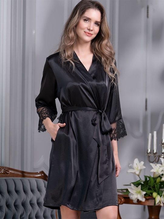 Черный XS, S/M, L/XL, XXL/XXXL Короткий классический запашной халат Mia-Amore с рукавами длиной 3/4, выполнен из смесового однотонного шелка. Низ рукавов обработан французским кружевом, которое инкрустировано кристаллами Swarovski. По бокам расположены карманы. 70% натуральный шелк, 25% полиэстер, 5% эластан