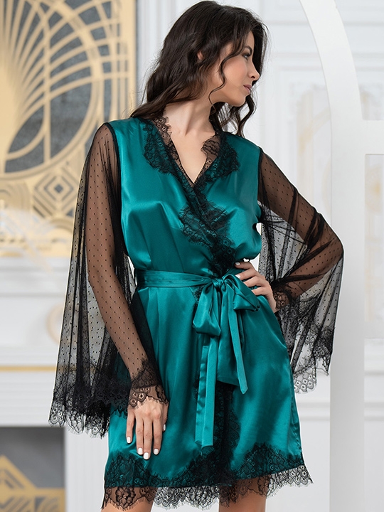 Черный L/XL, XXL/XXXL Короткий запашной халат Mia-Amore с длинными расширяющимися к низу рукавами выполнен из смесового шёлка. Рукава из сетки по низу, борт и низ халата декорированы контрастным широким кружевом. Халат запахивается на талии с помощью широкого пояса. 70% натуральный шелк, 25% полиэстер, 5% эластан