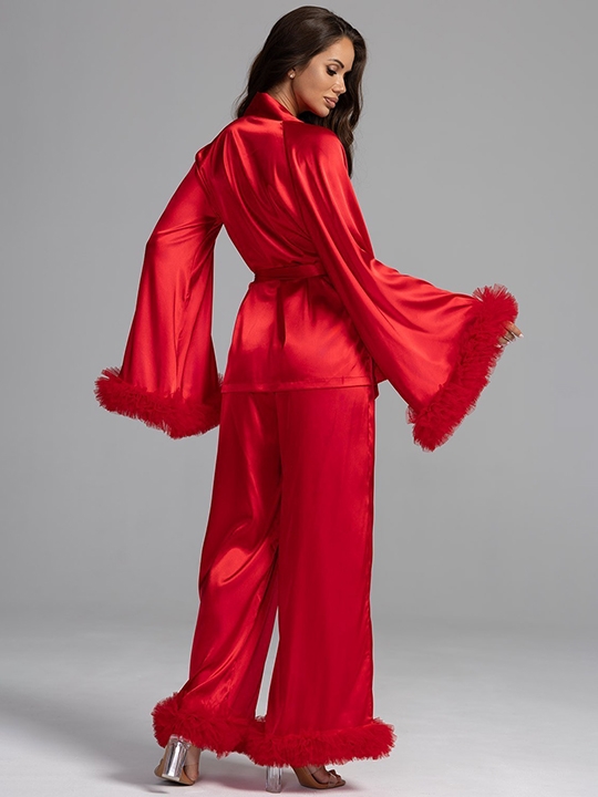 Красный S, M, L, XL, XXL, XXXL Комплект Mia-Amore состоит из брюк и короткого запашного халатика. Комплект выполнен из мягкого искусственного шёлка. Рукава запашного халата и брюки по низу украшены пышной многослойной сетчатой рюшей. Халат запахивается с помощью широкого пояса. 100% полиэстер