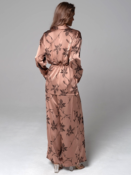 Мультицвет S, XL, XXL, XXXL, XXXXL, XXXXXL Комплект Mia-Amore состоит из рубашки с центральной потайной застёжкой на пуговицы и длинными рукавами, и брюк. Комплект выполнен из жаккардового двухцветного смесового шёлка. На рубашке утягивающая кулиса по талии. Широкие брюки с эластичным поясом и с боковыми карманами. 58% натуральный шёлк, 42% вискоза