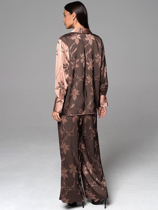 Мультицвет S, XXXXL, XXXXXL Комплект Mia-Amore состоит из блузы свободного силуэта с длинными рукавами и ассиметричной декоративной застёжкой на пуговицы и широких брюк. Комплект выполнен из жаккардового двухцветного смесового шёлка. Блуза выполнена в цветовом сочетании тёмного и светлого жаккарда. Брюки тёмного оттенка с эластичным поясом и с боковыми карманами. 58% натуральный шёлк, 42% вискоза